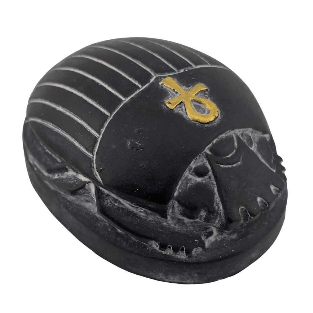 Small Egyptian beetle for appreciating ancient mythology and old world traditions. The Egyptian scarab beetle was associated very early on in Egypt with the generative forces of the rising sun and with the concepts of eternal renewal. The Egyptian symbol of renewal, the ankh, appears on top on his shell.