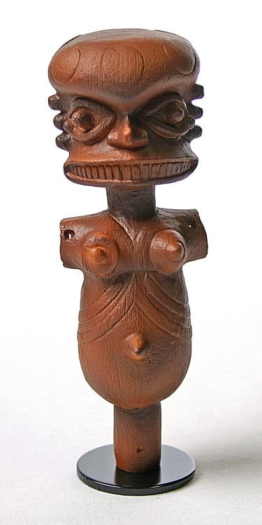 'Like the other images of the Ibibio, they are characterized by rounded shapes and a long row of teeth bared. Representations like these of evil spirits can be very frightening. Made from resin with a wood finish, metal stand. Measures: 5.5"H x 2"W x 1.75"D. Part of the African collection by Parastone Mouseion 3D.'