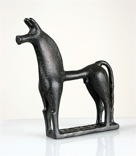 Greek Geometric Horse Statue (8th century BC) The horse was suitable for this innovative geometric simplification. Every bronze foundry on the Greek continent developed their own variations, but the "pig's snout", the pointed ears and the triangular notches in the base of the sculpture remained characteristic. measures 6.5"H x 6.2"W x 1.75"D. Part of the Parastone Museum Collection.