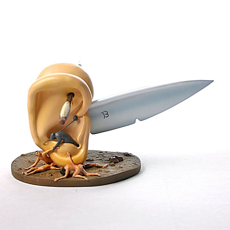 'Two enormous ears, held together by an arrow and a knife jammed in between. Is there an allegorical medieval symbolism behind this? Hieronymus Bosch shows us how we mortal souls, arisen from earthly paradise, are on our way to the atrocious ordeals of hell via our unchaste lives on earth. This clever sculpture adaptation is taken from Bosch''s Garden of Earthly Delights, an altarpiece used to teach church goes about the eternal damnation for sinners. This sculpture is a wonderful study of how imagery is used to teach people through fantasy. Part of the Parastone Museum Collection. Made from resin with hand painted details. Measures: 3.5"H x 6"L x 7"W.'
